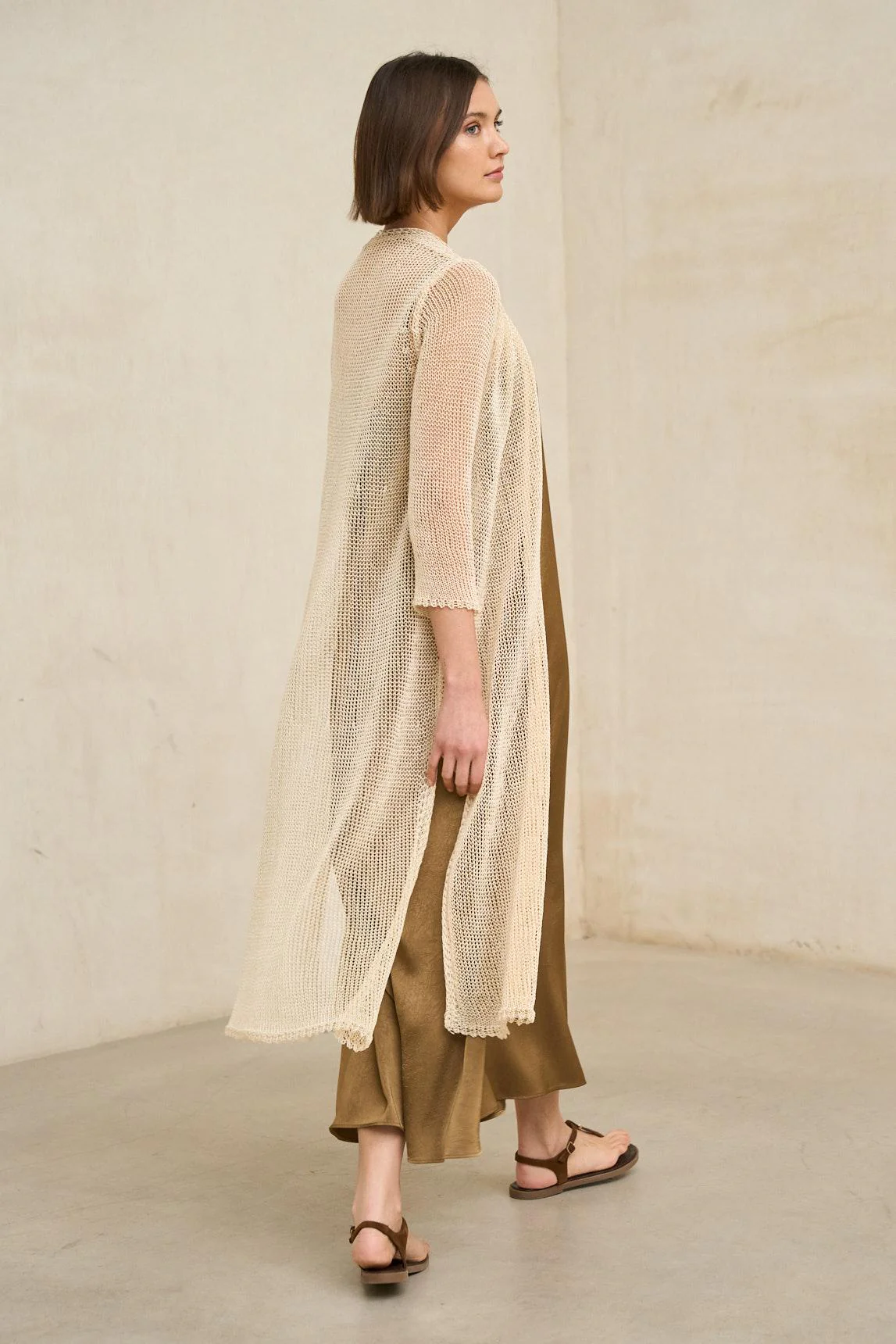 La levita de punto Avenel beige es una pieza ligera y envolvente confeccionada en tejido de punto fino calado, con una textura abierta que aporta profundidad y un movimiento delicado al conjunto. Su diseño largo y abierto estiliza la silueta, creando una línea vertical elegante y fluida.