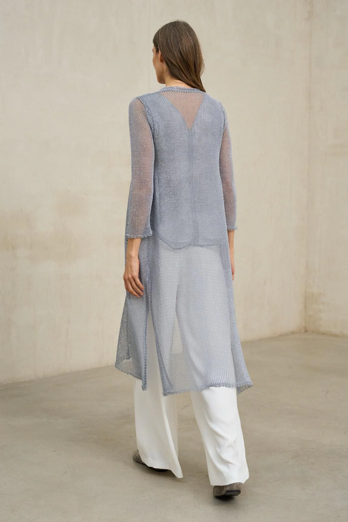 La levita de punto Avenel azul grisáceo combina ligereza y sofisticación en un diseño abierto de líneas puras. Confeccionada en tejido de punto fino con textura calada, su estructura ligera genera un juego visual delicado y elegante.