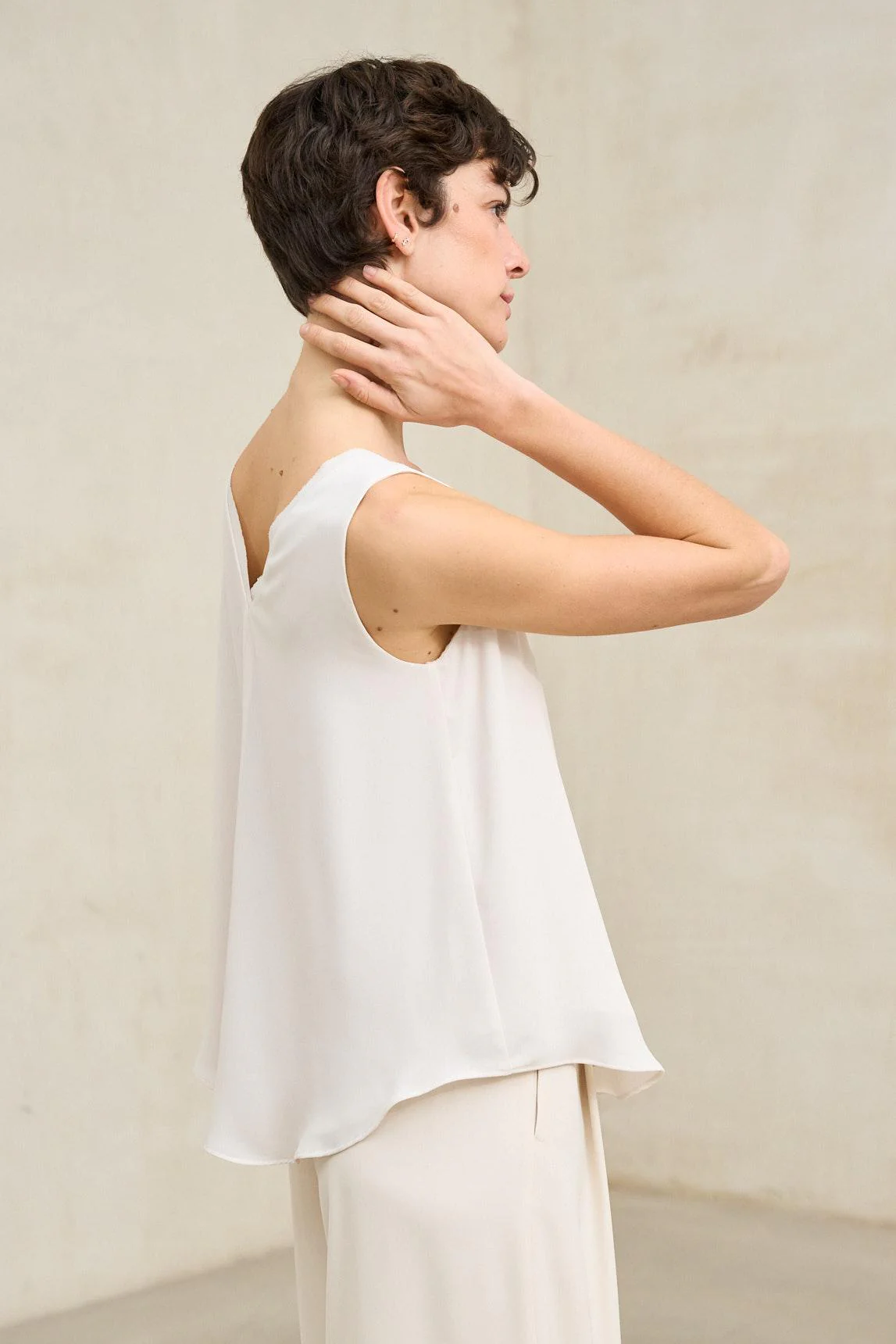 Minimalista y versátil, el Top Inès blanco roto funciona como base depurada tanto en looks cotidianos como en propuestas más pulidas. Transmite frescura refinada y equilibrio, convirtiéndose en una pieza esencial para construir conjuntos serenos y contemporáneos.